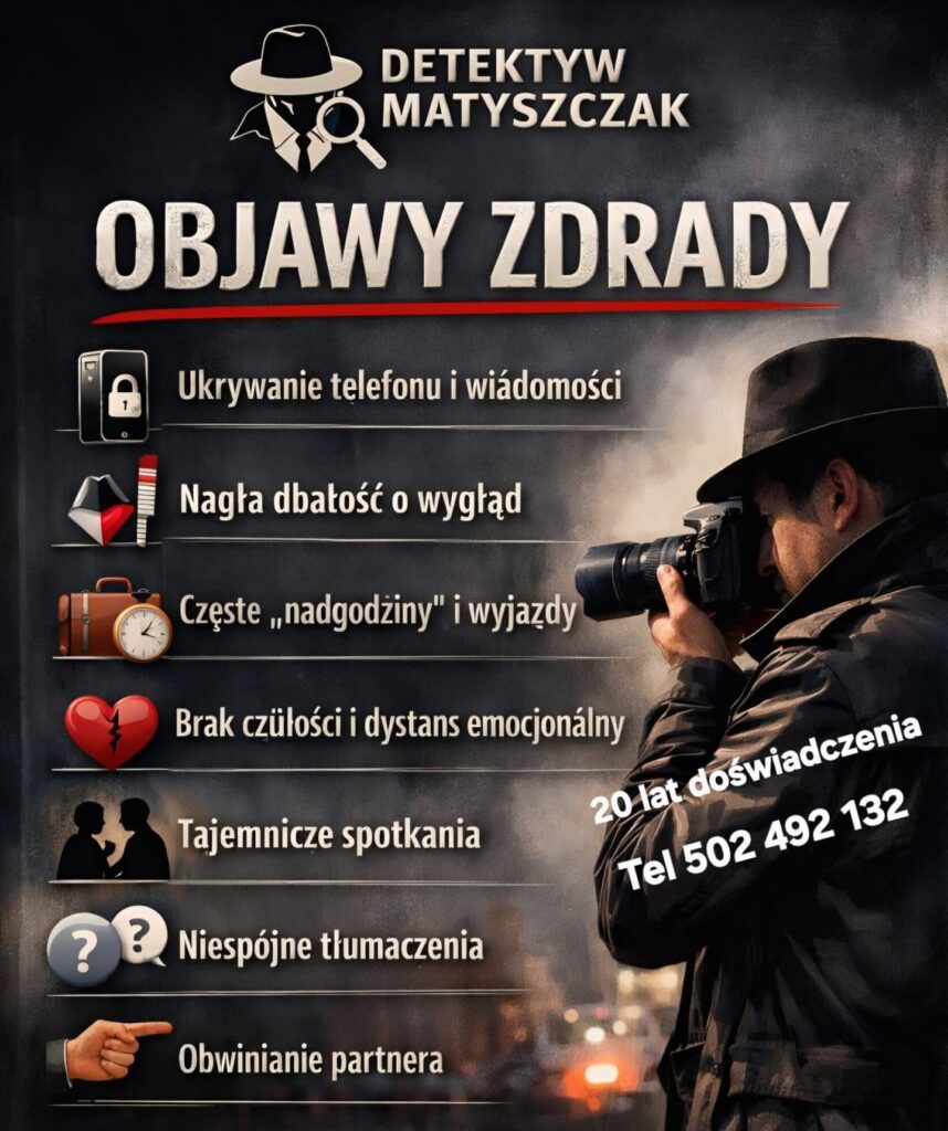 Zdrada może objawiać się zmianami w zachowaniu: ukrywaniem telefonu, nagłą dbałością o wygląd, częstszymi nadgodzinami, wyjazdami służbowymi, brakiem czułości czy obwinianiem partnera. Jednak pojedynczy sygnał nie jest jednoznacznym dowodem zdrady – ważne jest obserwowanie kilku objawów łącznie. Prywatny Detektyw Warszawa+1